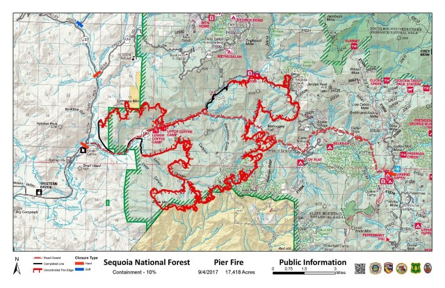 Area Closures: Sequoia National Forest closure includes trails, roads, and lands around the Pier Fire: Closure Order No. 0513-17-34 https://inciweb.nwcg.gov/incident/article/5548/39662/ CALFIRE has closed Mountain Home State Forest, and Tulare County has closed Balch Park. All areas are closed until the fire is brought under control. Please keep in mind, suppression repair work will take additional time after the fire is contained, recreationists should plan ahead.