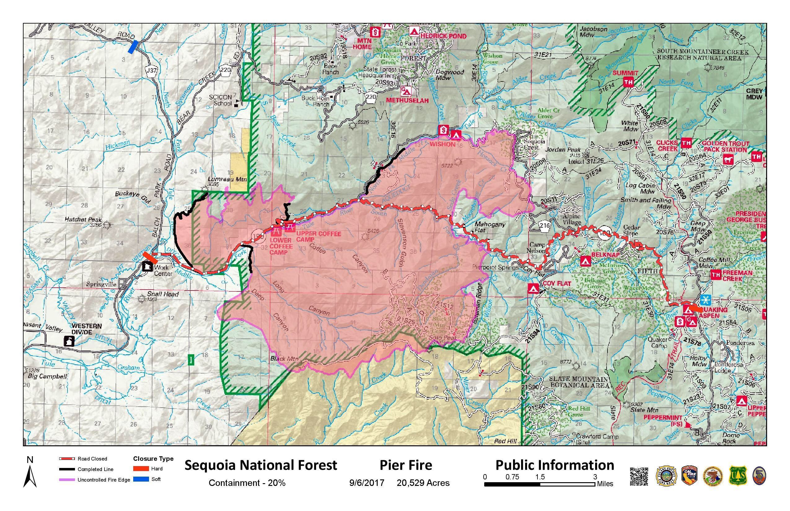 Area Closures: Sequoia National Forest closure includes trails, roads, and lands around the Pier Fire: Closure Order No. 0513-17-34 https://inciweb.nwcg.gov/incident/article/5548/39662/ CAL FIRE has closed Mountain Home State Forest, and Tulare County has closed Balch Park. All areas are closed until the fire is brought under control. Please keep in mind, suppression repair work will take additional time after the fire is contained, recreationists should plan ahead.