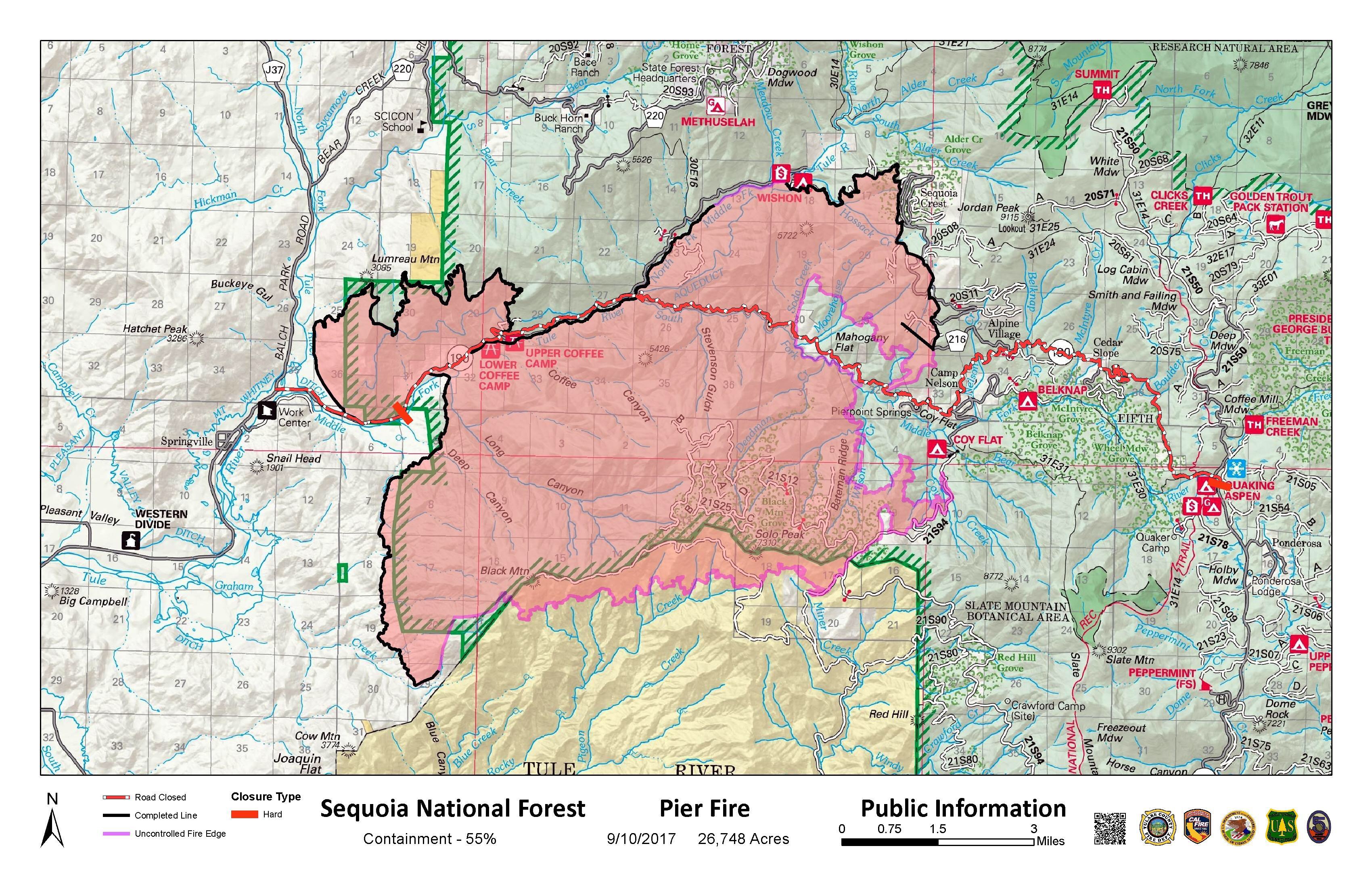 Area Closures: Sequoia National Forest trails, roads, and lands around the Pier Fire are closed (Closure Order No. 0513-17-34, https://inciweb.nwcg.gov/incident/article/5548/39662/. CAL FIRE has closed Mountain Home State Forest, and Tulare County has closed Balch Park. All areas are closed until the fire is brought under control. Suppression repair work will take additional time after the fire is contained; recreationists should plan ahead.