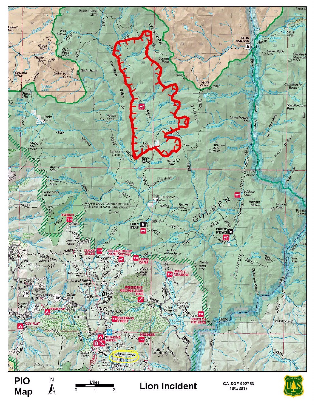 The Lion Fire, ignited by lightning on September 24, has grown to approximately 7,850 acres. The fire is burning northward from Lion Meadow within the Golden Trout Wilderness in the Sequoia National Forest. Most of the fire’s spread has been through areas previously burned in the 2011 Lion Fire and 2006 Tamarack Fire.