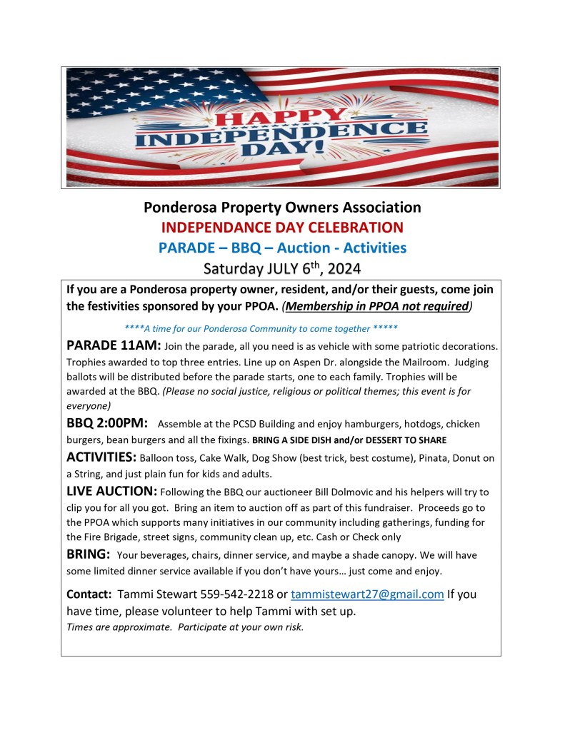 If you are a Ponderosa property owner, resident, and/or their guests, come join the festivities sponsored by your PPOA. (Membership in PPOA not required)